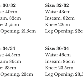 | Pants width Gents | 27, 28, 29, 30, 31, 32, 33, 34, 35, 36, 38, 40 |