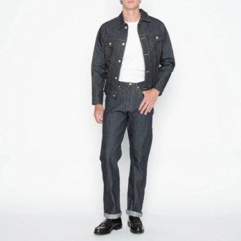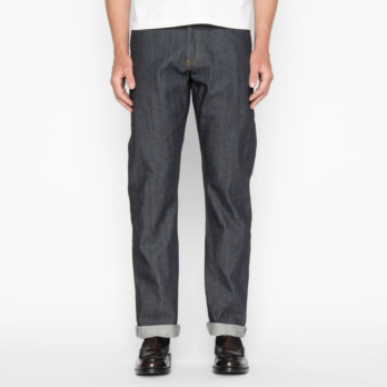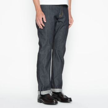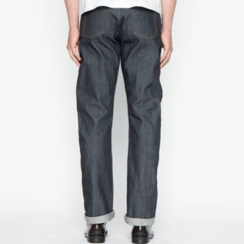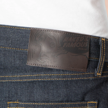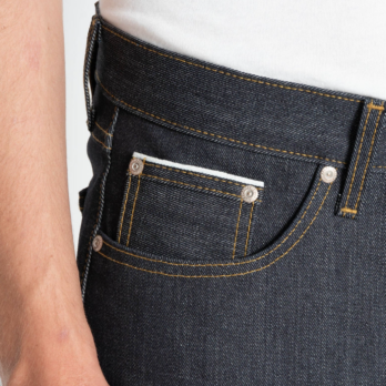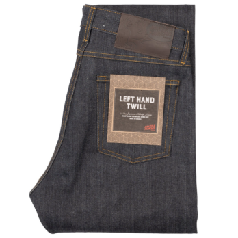 The Left Hand Twill Selvedge is a 13.75oz indigo rope dyed Japanese selvedge denim, woven on vintage shuttle looms in a left hand twill construction. When worn over time, this construction will provide a softer feeling denim and will emphasize vertical fading. Other details include contrast stitching, full grain brown leather patch, white selvedge ID, silver metallic buttons and rivets.
